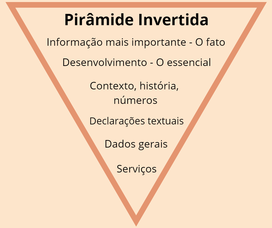No jornalismo, a Pirâmide Invertida tem como principal objetivo colocar os fatos mais importantes no primeiro parágrafo do texto, para depois dissertar sobre os pontos não tão relevantes da informação. Na prática, a Pirâmide funciona da seguinte maneira: